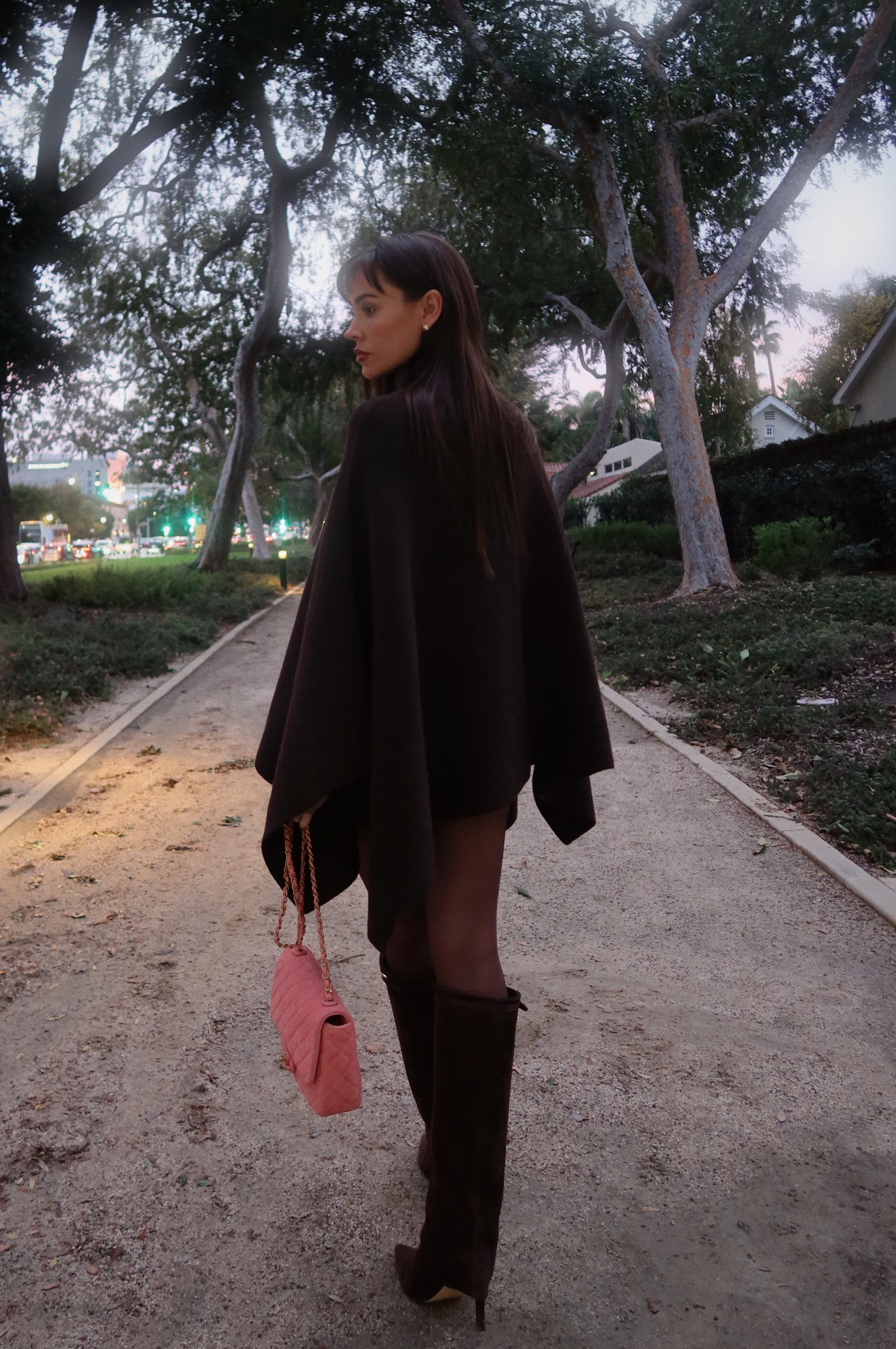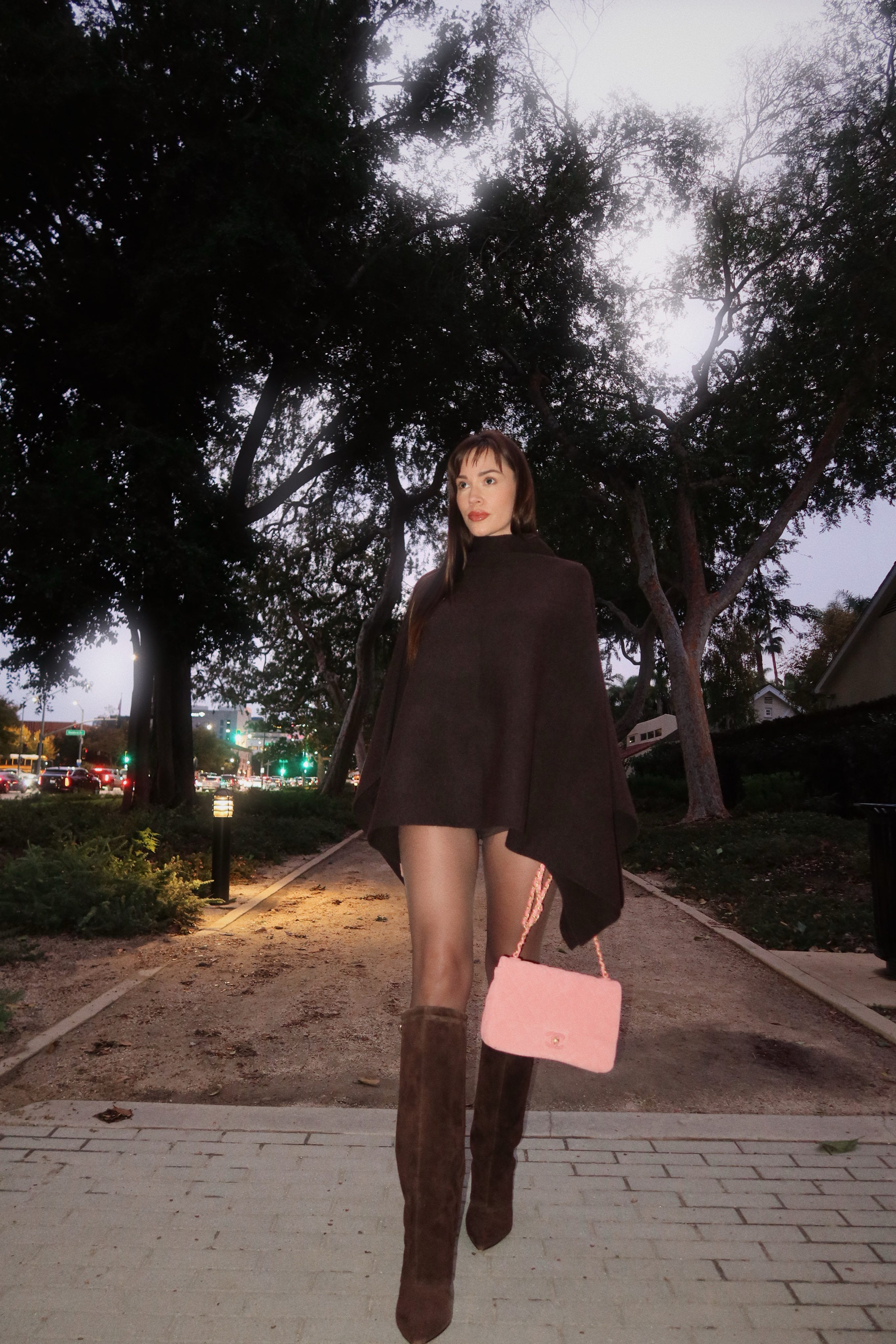 An iconic, delicate pink. Somehow sophisticated and girlish at once. Supple suede punctuated by gorgeous monochromatic leather CCs. Though this bag is part of the Cruise collection, I had a vision of her transcending seasons — and as I wanted to wear her straight away, I styled a look with 50 shades of brown… and a sweet Chanel cherry on top.